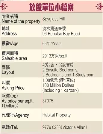 淺水灣是港島南區一綫豪宅地段,位於淺水灣道96號的豪宅Spyglass Hill,前迎此招牌靚 景。今次為大家精選該盤罕有相連戶放盤,實用面積2913方呎,4房2套設計,另有一間 書房,廳房均對正淺水灣山海景。現連1車位,叫價1.08億,實用呎價約37075元。