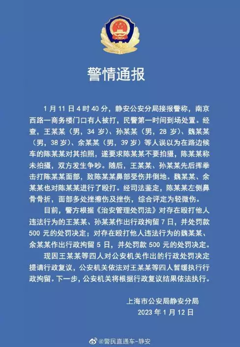 上海靜安警方12日發佈通報,11日4時許接報南京西路一棟商業大廈門口有人被打。警方指,王某某等人誤以為在路邊候車的陳某某對其拍照,遂要求陳某某不要拍攝,陳某某稱未拍攝,雙方發生爭吵。王某某等人對陳某某毆打。