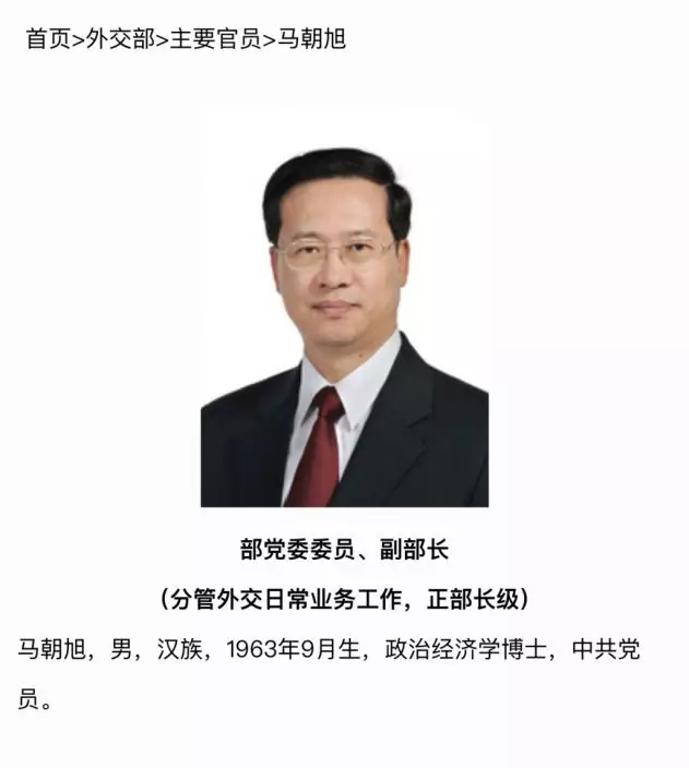 中國外交部網站主要官員介紹頁面顯示,馬朝旭為部黨委委員、副部長(分管外交日常業務工作,正部長級)。