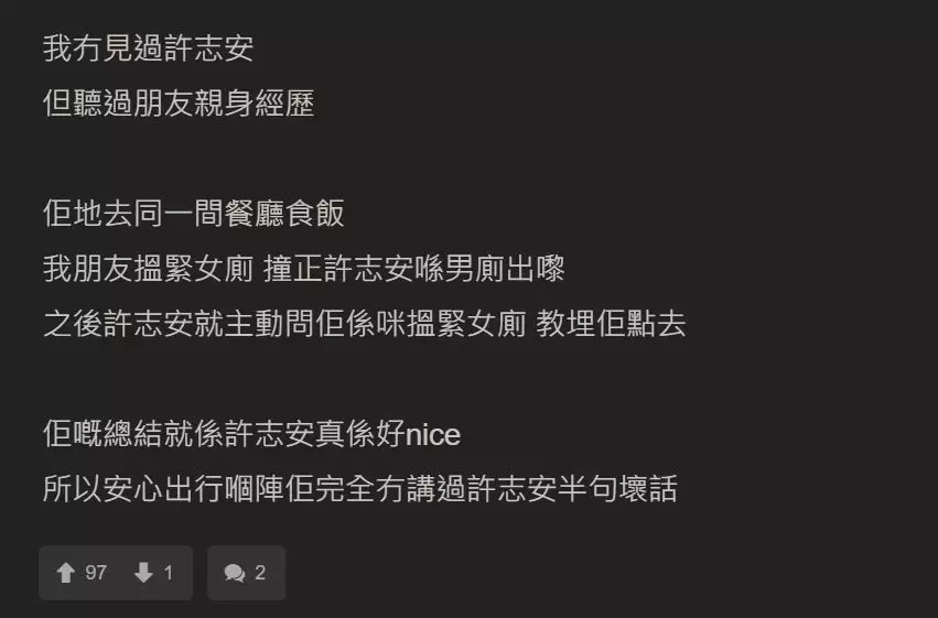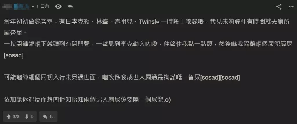 亦有不少網民分享遇到明星的搞笑經歷,原來不少男士都曾在洗手間遇到大明星,但李克勤就被一名曾於錄音室工作的網民大爆「如廁唔識規矩」,令這位網民不禁表示:「依加諗返起反而想問佢知唔知兩個男人屙尿係要隔一個尿兜?」