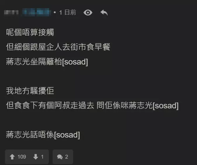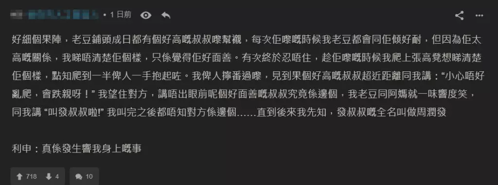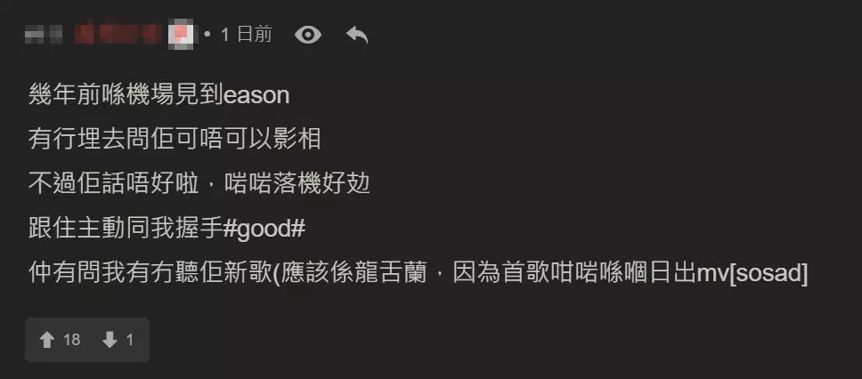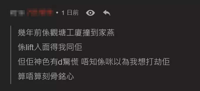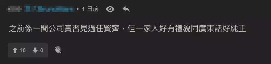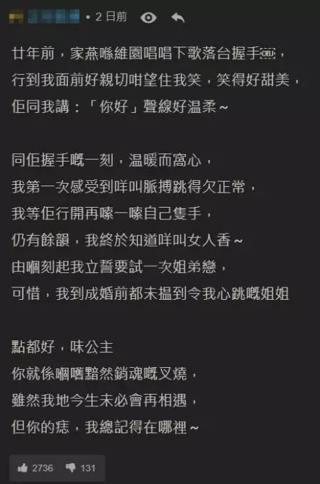 近日「連登討論區」有網民開帖討論「有無試過同明星有刻骨銘心嘅接觸」,樓主分享20年前在維園遇到「味公主」薛家燕表演,有幸與薛家燕握手,更大讚薛家燕親切地看着他甜笑,用極温柔的聲線對他說「你好」,樓主憶述握到薛家燕手的感受,令不少網民都表示很有畫面:「同佢握手嘅一刻,温暖而窩心,我第一次感受到咩叫脈搏跳得欠正常,我等佢行開再嗦一嗦自己隻手,仍有餘韻,我終於知道咩叫女人香。由嗰刻起我立誓要試一次姐弟戀,可惜,我到成婚前都未揾到令我心跳嘅姐姐。」樓主的分享獲得近3,000正評。