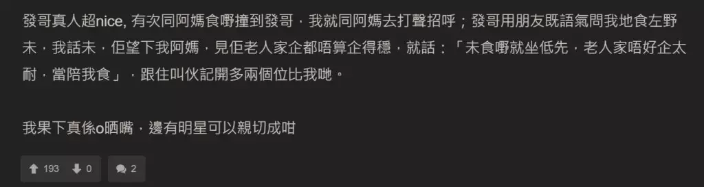而帖文中最多網民激讚的明星就是影帝周潤發,除了對邀合照的途人有禮貌,亦非常體諒老人家,更有網民分享兒時遇到周潤發的回憶。另外,蒙嘉慧、鍾嘉欣、陳奕迅、蔡一傑、古天樂、許志安、任賢齊、鄭伊健等都分別被網民指親人勁親切。