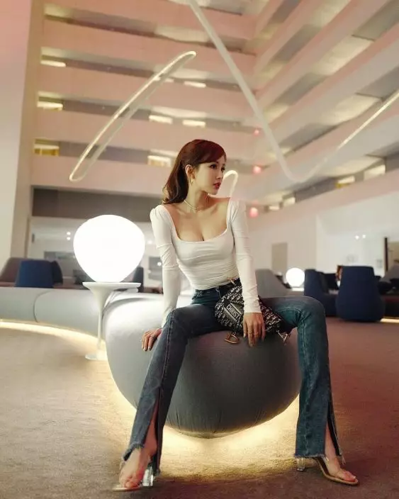她身穿仿肚兜設計的上衣,搭配同色系長褲,背後僅靠一條綁帶固定,大晒白滑美背,更真空上陣,無論從背面或側面角度看,其豐滿上圍與纖瘦腰線皆一覽無遺,極盡火辣!此外,下身長褲質地超薄,在陽光照射下透視度極高,蜜桃臀形若隱若現,性感程度爆燈!