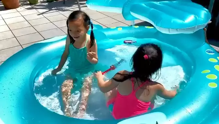 兩個囡囡可以在花園開小型水池玩水。