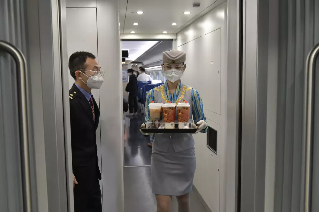 上午8點40分左右,高鐵上有配戴護目鏡及口罩的乘務員售賣飲品,有凍熱咖啡、奶茶提供,其中熱飲26元(人民幣,下周)、凍飲26蚊,支持現金、微信與支付寶支付。
