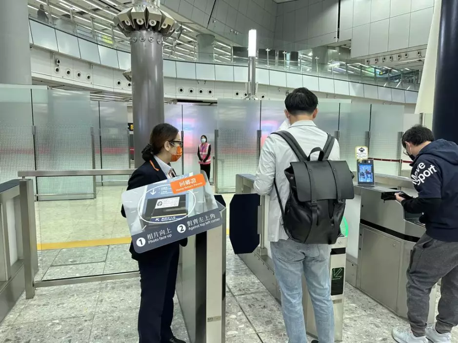 《星島》記者於上午7時18分入閘,有港鐵職員手持指示牌,提醒乘客「相片向上」、「對齊左上角」,唯閘口機器靈敏度欠佳,不少市民需多次嘗試。入閘後隨身行李需過安檢,旅客亦需在此時出示核酸陰性證明與證件,供職員查證。《星島》記者完成安檢後,經長扶手梯,於7時23分抵達過境大廳。