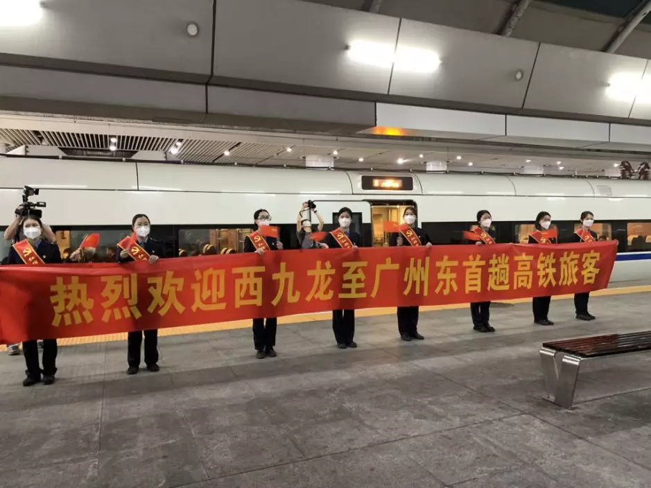 《星島》記者親身實測往廣州東列車。在廣州東站,有工作人員拉起橫幅歡迎乘客。