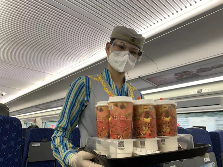往廣州東列車上,有戴上口罩和護目鏡的乘務員售賣飲品。