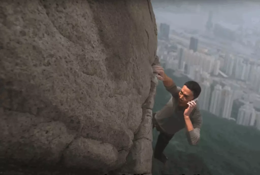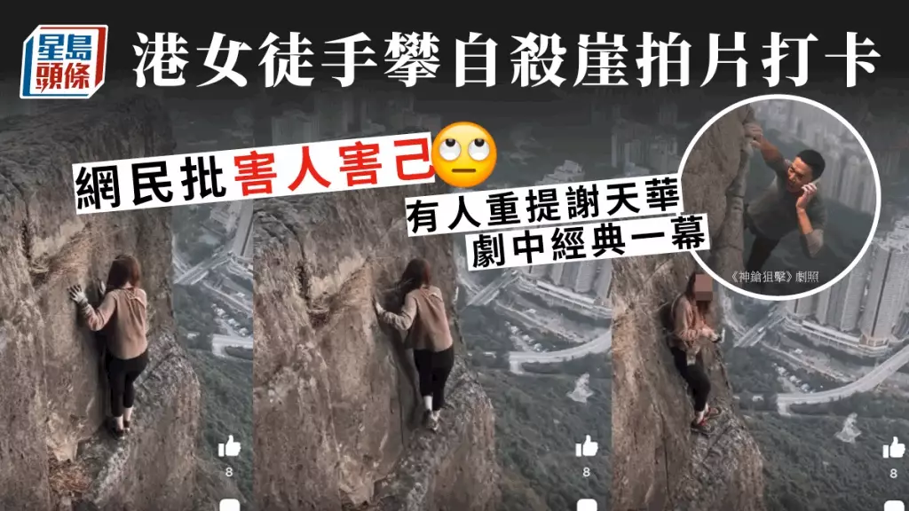 女子徒手攀飛鵝山自殺崖並拍片打卡。網上影片截圖/《神鎗狙擊》劇照