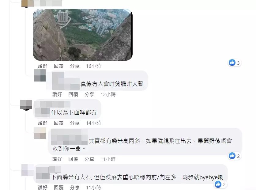 有人分享指,「我哋上過N次亦都研究過嗰個位,根本係唔出得,因為嗰到真係一跣係直插懸崖樹林,無任何大石平台」。FB截圖