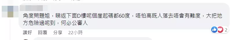 有人則認為女子的行為沒有問題,並指「角度問題啫,睇返下面啲樓呢個崖起碼都60度,唔怕高嘅人落去唔會有難度,大把地方危險過呢度,何必公審人」、「其實係咪下面有平台影唔到,會唔會係角度問題」、「正常人都驚,何況一個女仔,雖然我未去過嗰度,但我相信個女仔對落下面一定有平地,唔會係崖邊」等。有網民則反駁指,「冇事網上見,有事A1見」、「都危險」、「其實都有幾米高同斜,如果跣親飛往出去,果嚿嘢係唔會救到你一命」、「下面幾米有大石,但佢跌落去重心唔穩向前/向左多一兩步就byebye喇」等。