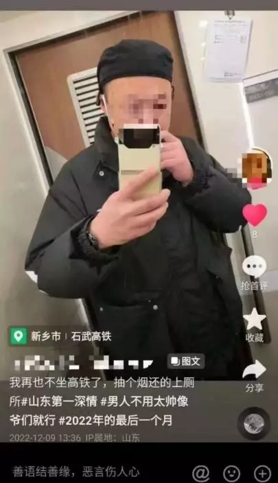 近日,一名男在網上發放短片兼發文稱:「我再也不坐高鐵了,抽個煙還得上廁所」,炫耀在高鐵上違例吸烟,甚為囂張,其後遭人舉報,民警展開調查。