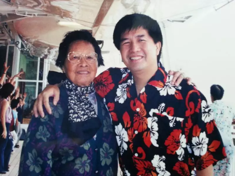 九七年邱榮光回港陪伴母親,圖為○二年時他與母親乘郵輪旅遊。