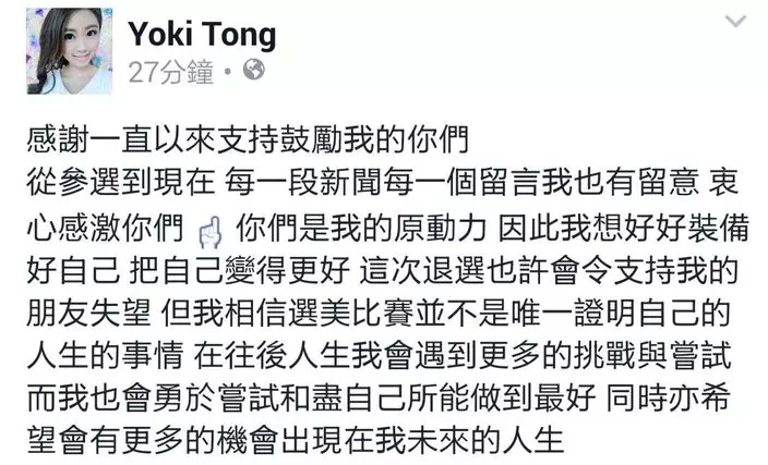 Yoki寫道:「感謝一直以來支持鼓勵我的你們。從參選到現在,每一段新聞每一個留言我也有留意,衷心感激你們,你們是我的原動力。因此我想好好裝備好自己,把自己變得更好,這次退選也許會令支持我的朋友失望,但我相信選美比賽並不是唯一證明自己的人生的事情,在往後人生我會遇到更多的挑戰與嘗試。而我也會勇於嘗試和盡自己所能做到最好,同時亦希望會有更多的機會出現在我未來的人生。」