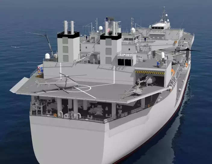 改裝後,這一戰艦設置了一個船體後部的飛行甲板,可以搭載較多的無人機,甚至可以起降F-35B隱身戰鬥機。過去,「遠征海上基地艦」已經被用於支持各種小型無人機和無人艇,經過改裝後,可以顯著擴展現有的能力。例如,它將可以容納更大的水下無人航行器,包括波音共識建造的「逆戟鯨」無人潛艇。新的旋轉式無人潛航器釋放和回收系統,將令無人平台的出發、回收變得更簡單、更快速。而且,新的設計可能會避免在艦艇底部開設巨大的無人艇進出開口,這樣在波濤洶湧的水域作業時,母艦的穩定性能得到改善,擴大這一母艦和無人艇的使用率。