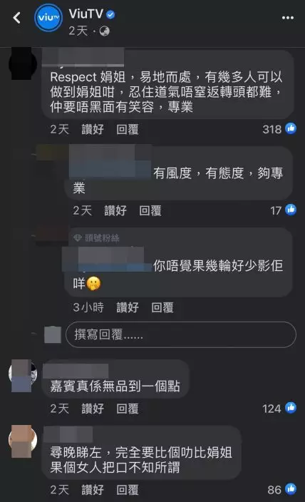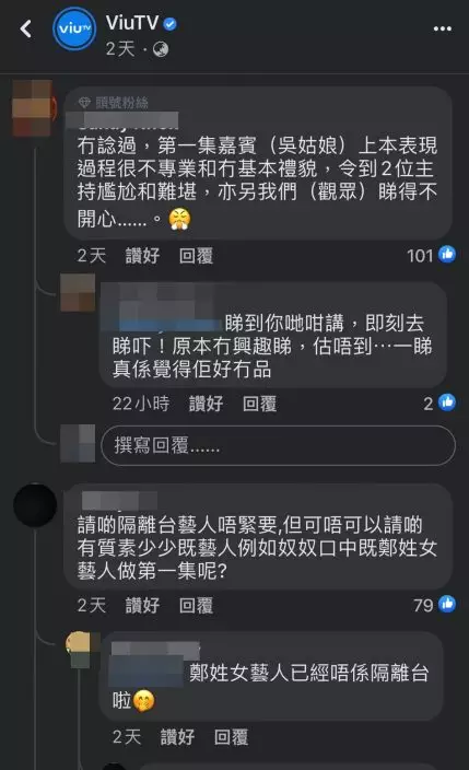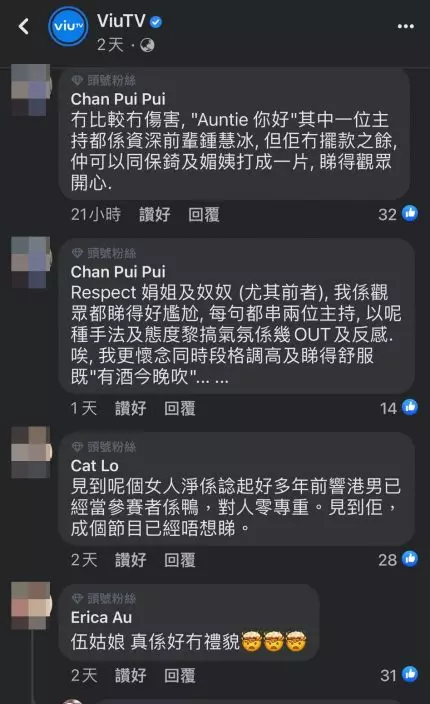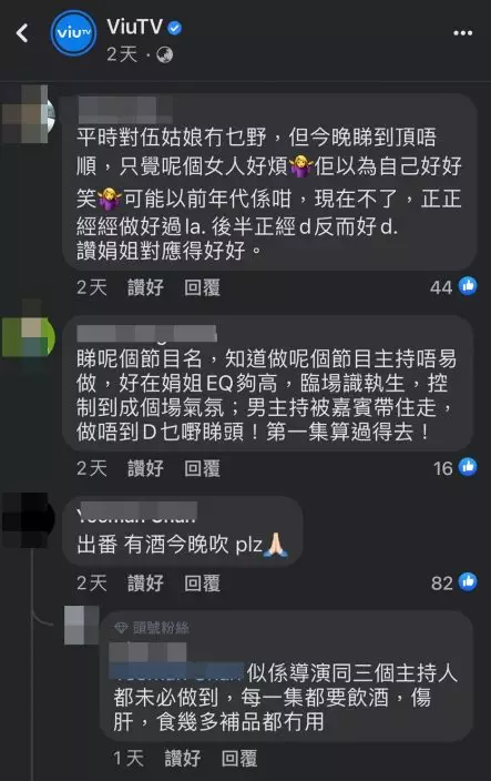 節目出街後,好多網民直斥伍姑娘冇禮貌兼冇品:「串XX 真係以為自己邊位」、「伍乜乜好冇禮貌 果然係老人台老屎忽」、「又惡又唔好笑」、「眼尾都唔多望娟姐 小癲」、「冇諗過,第一集嘉賓表現過程很不專業和冇基本禮貌,令到2位主持尷尬和難堪,亦令我們(觀眾)睇得不開心……。」、「以為自己老seafood 無禮貌,娟姐加油」、「見到佢超級冇禮貌,欠口德,高傲自大,不尊重人,尤其批評女主持,娟姐支持你,不過一見到佢忍受不了她手舞足度,終於冇睇,下一集再睇娟姐支持你」、「句句窒住哂」及「伍姑娘真係好嘈好無禮貌,成晚唔知睇咗啲咩,難為咗2位主持!」