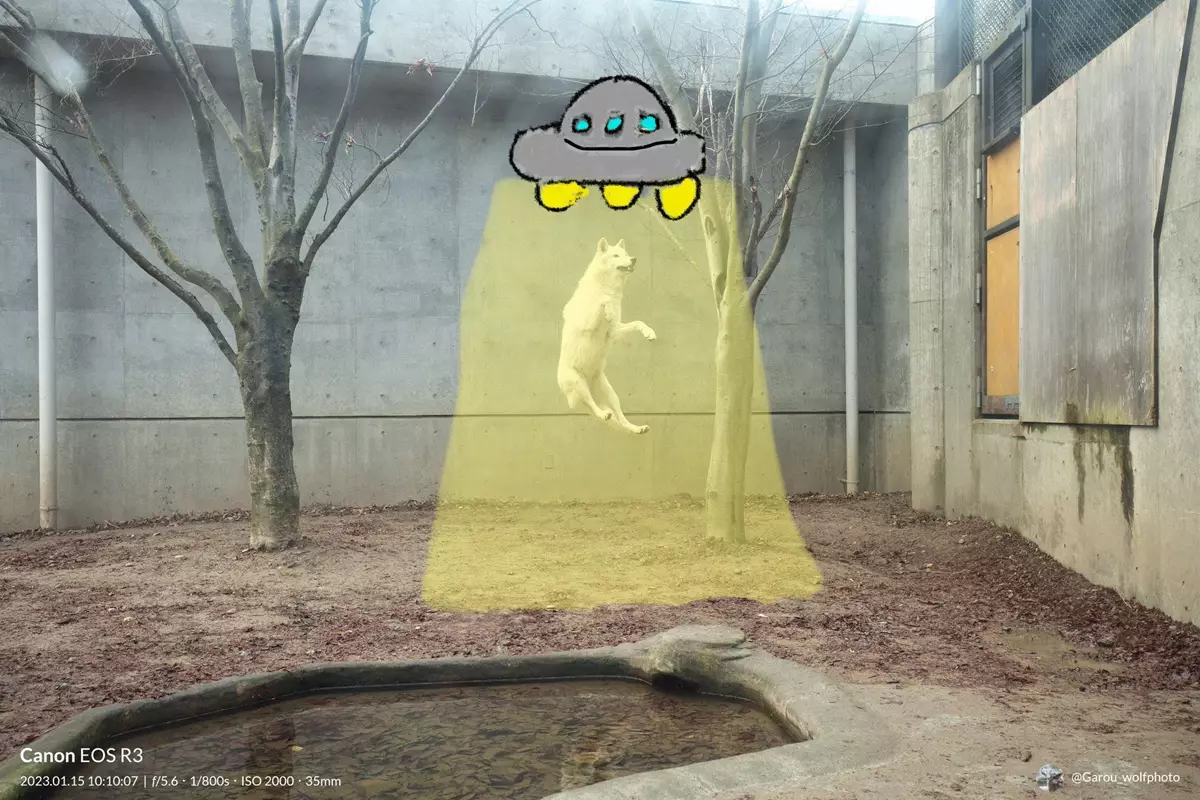 25歲攝影師@garou_wolfphoto平時就非常喜歡拍攝狼,近日他到秋田市大森山動物園遊玩,經過北極狼展區時意外捕捉到一張詭異相,一隻雪白的北極狼竟漂浮在半空中,前後所有均空無衣物,看起來像是被神秘力量抓了起來一般,畫面相當獵奇。
