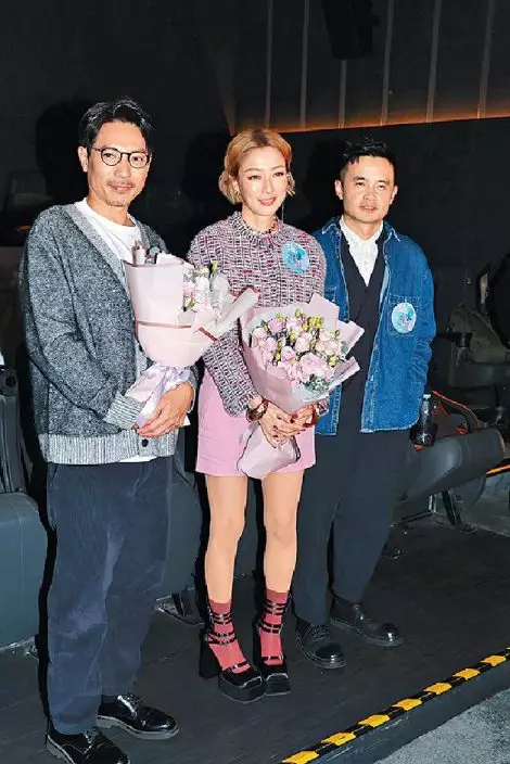 ■導演賈勝楓(右)向鄭秀文及陸駿光獻花。