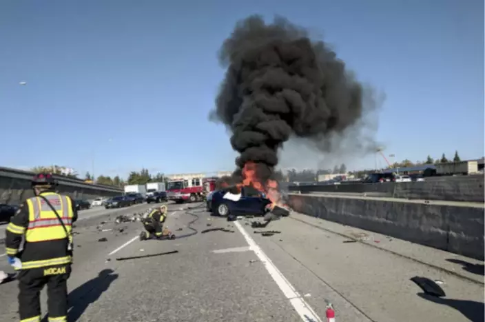 黃偉倫駕駛的特斯拉Model X起火現場 圖片來源:electrek
