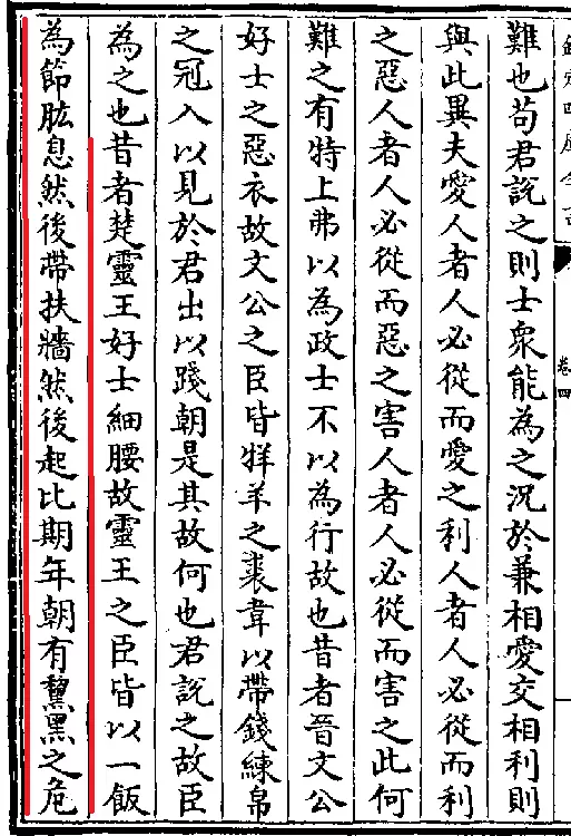 據說,楚靈王喜好細腰。不過不是女人的腰,而是男人「士人」之腰。《戰國策》或《兼愛》篇中有記載這個故事:「昔者楚靈王好士細腰,故靈王之臣皆以一飯為節,脅息然後帶,扶牆然後起。比期年,朝有黧黑之色。」故事是說,楚靈王喜歡臣子擁有纖腰,所以朝中大臣每天只吃一餐飯,企圖控制腰圍。他們每天上朝前整裝,都會收腰,抑制呼吸,再將腰帶束緊,弄得扶著牆壁才能站起來。到了第二年,滿朝文武們的臉色都呈黑黃色。