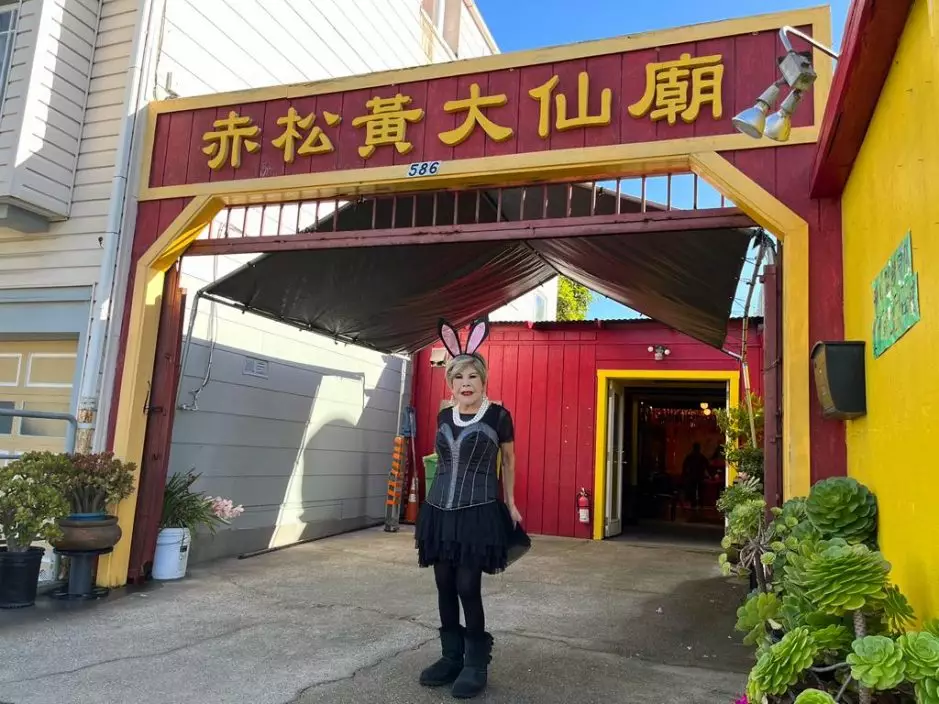 黃夏蕙身穿短裙黑絲兔女郎裝到三藩市黃大仙廟上香。