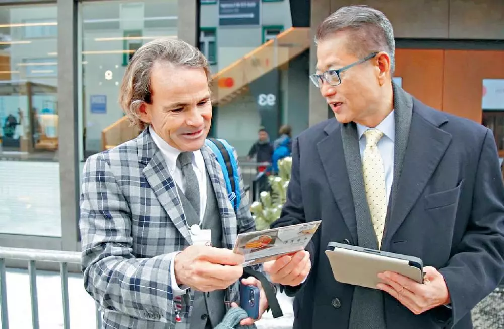 財爺陳茂波喺facebook專頁發放一段短片,話剛結束外訪瑞士達沃斯行程,連日除咗同政商界領袖會面外,亦不忘向當地人介紹展示香港地標,包括維港、天星小輪等。財爺攞住iPad,喺街頭向一名女途人展示西九戲曲中心相片,叫佢可帶多啲朋友嚟香港,女途人得知陳茂波係財爺後驚歎:「Wonderful!」,大讚戲曲中心好靚。