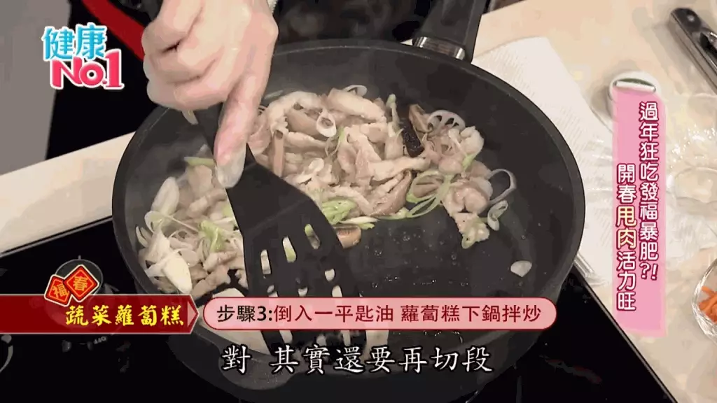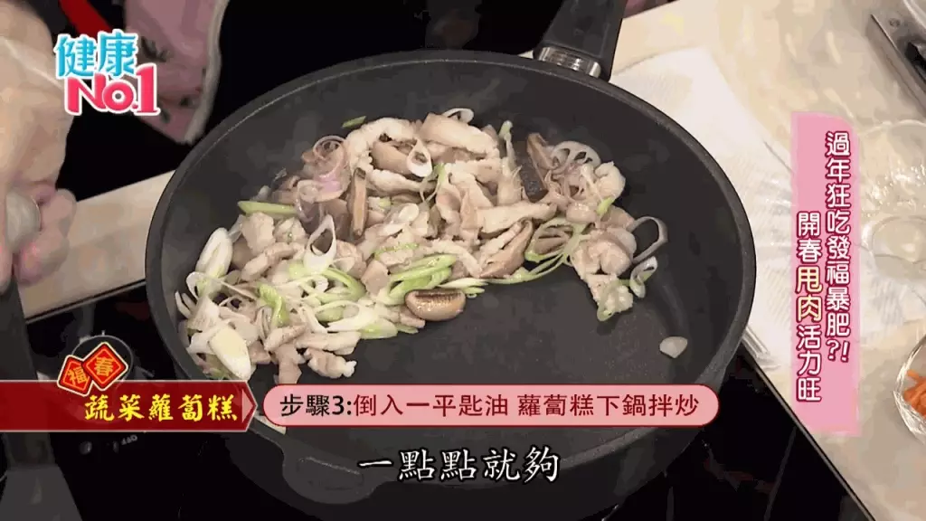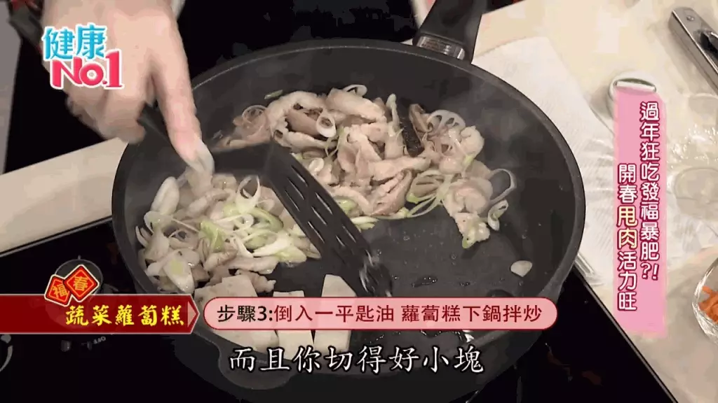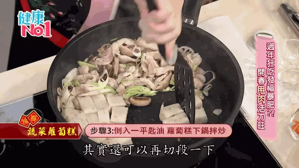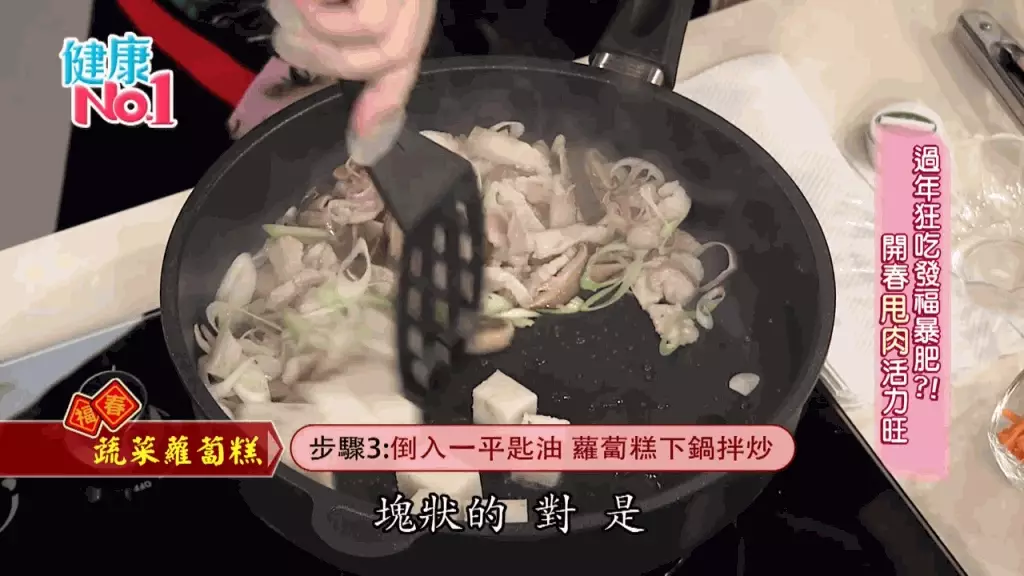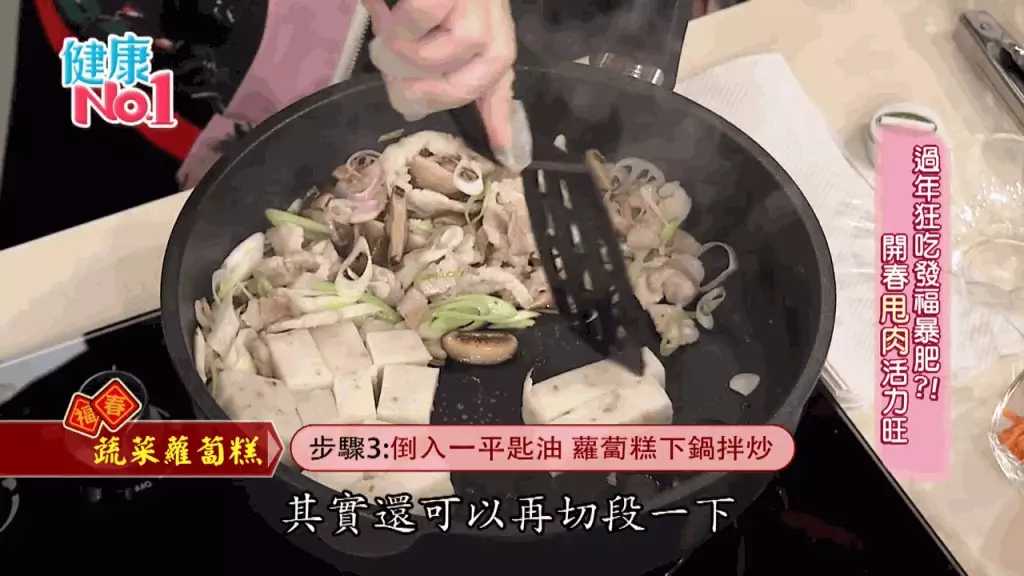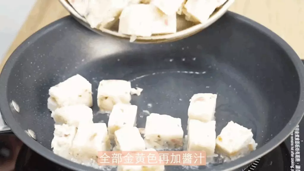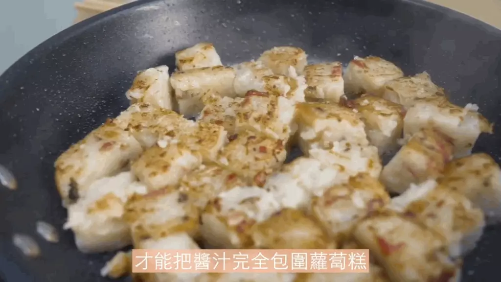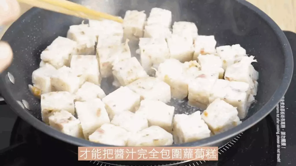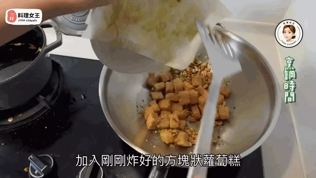 片段示範的是台式蘿蔔糕,但港式蘿蔔糕亦適合這種做法。加肉炒時,不用加油。