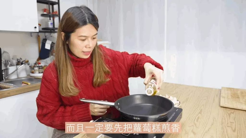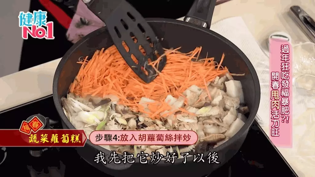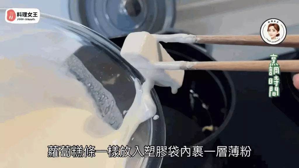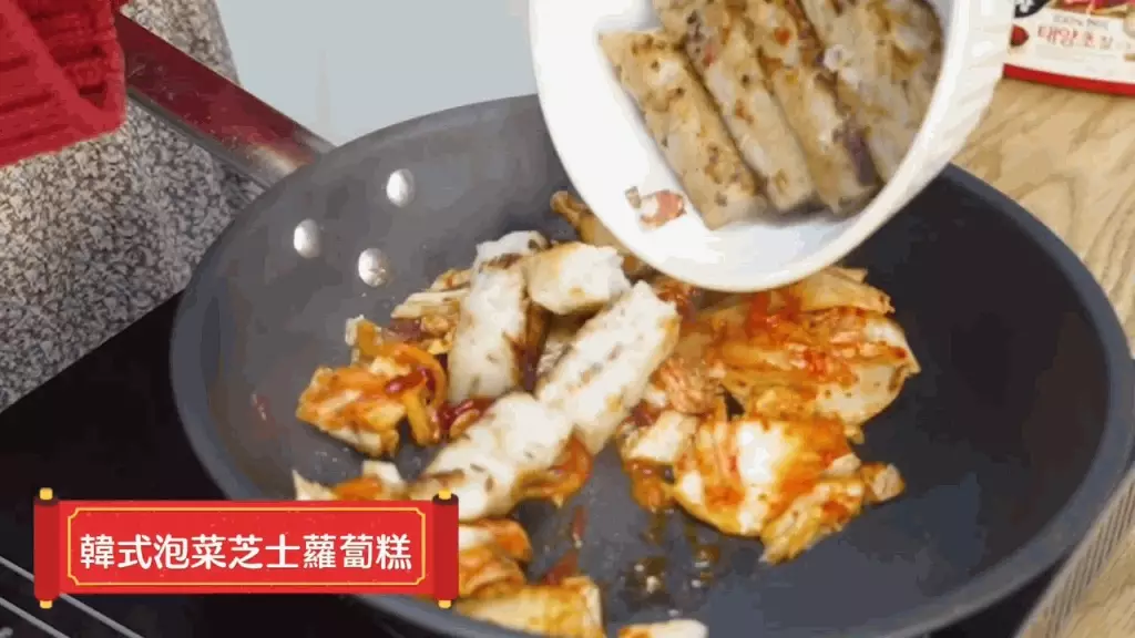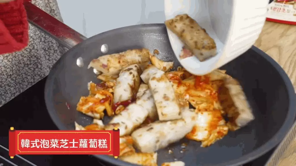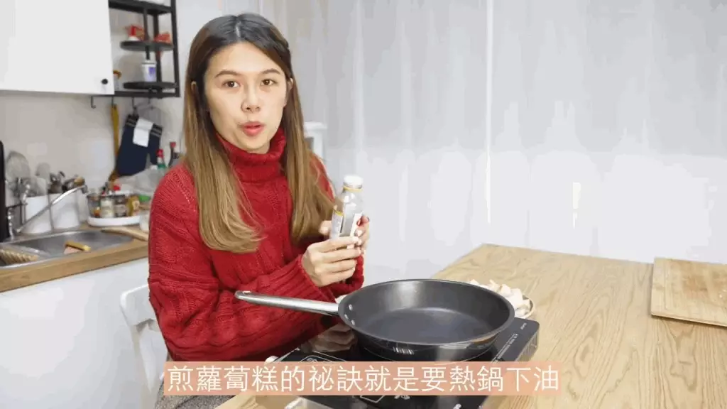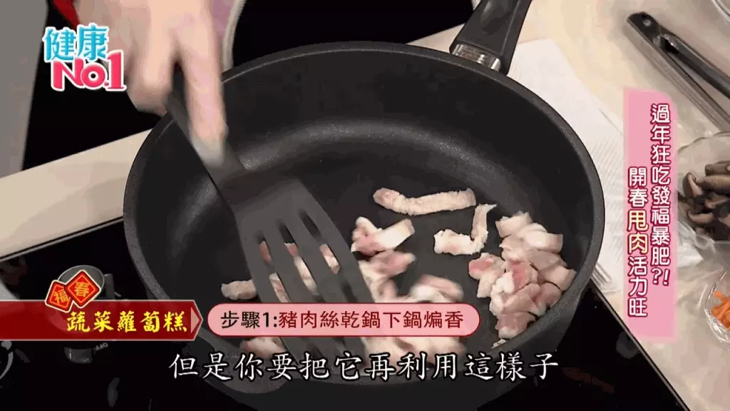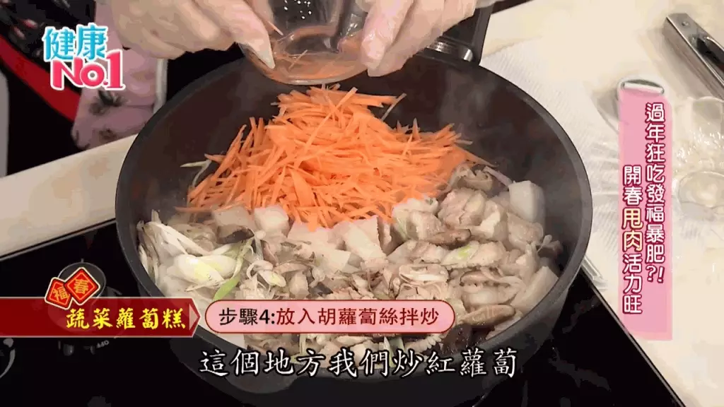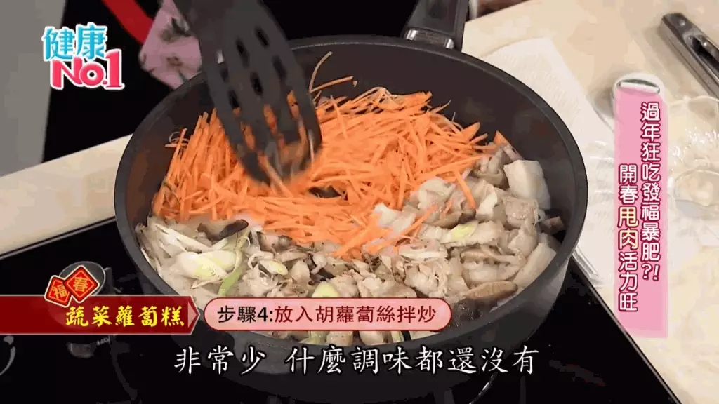 片段示範的是台式蘿蔔糕,但港式蘿蔔糕亦適合這種做法。加肉炒時,不用加油。