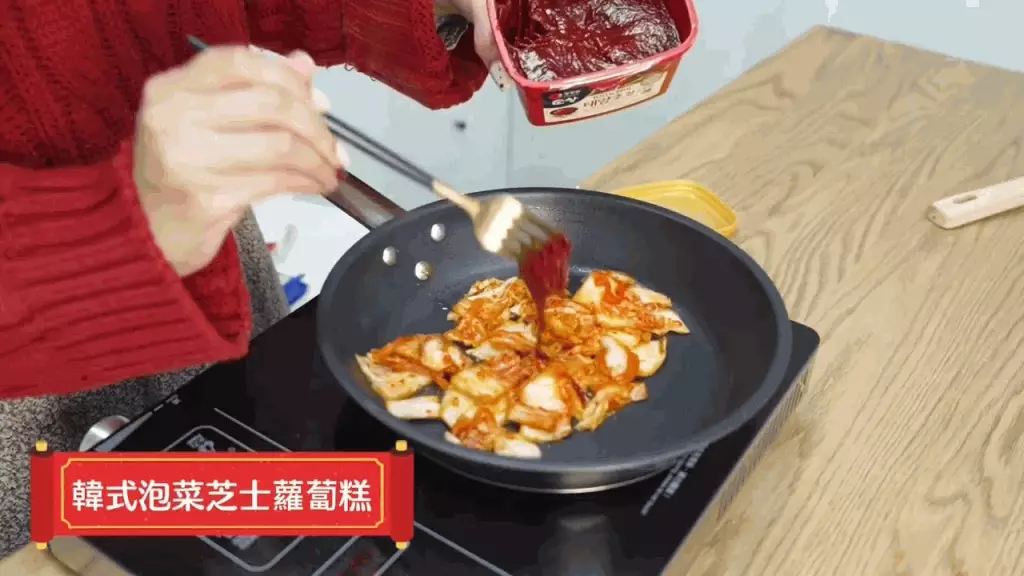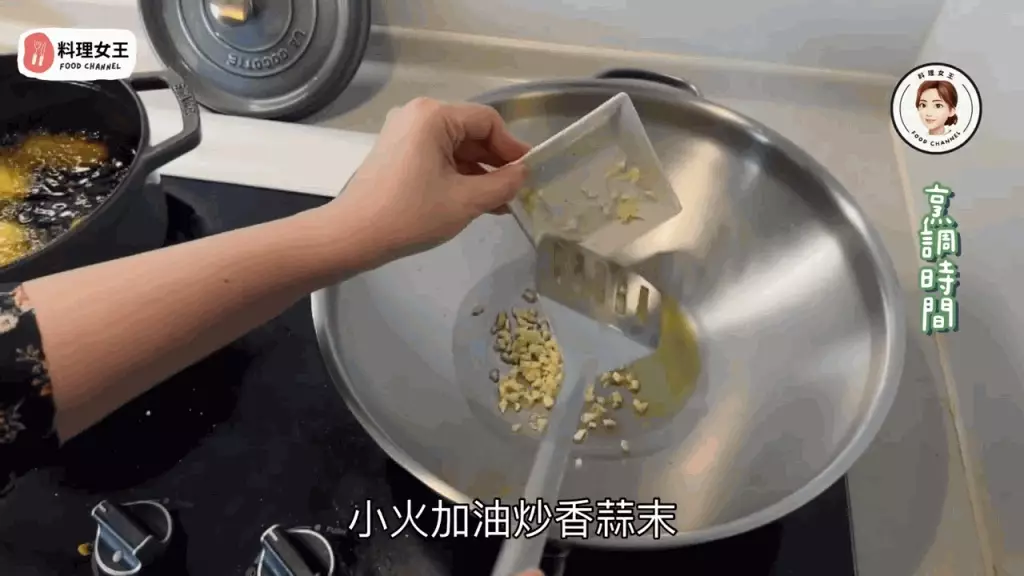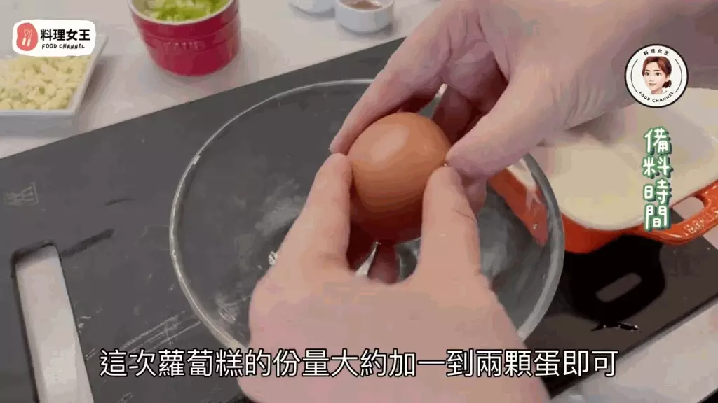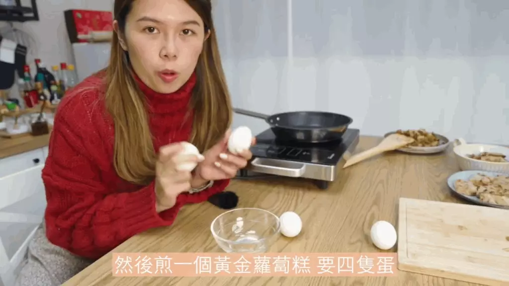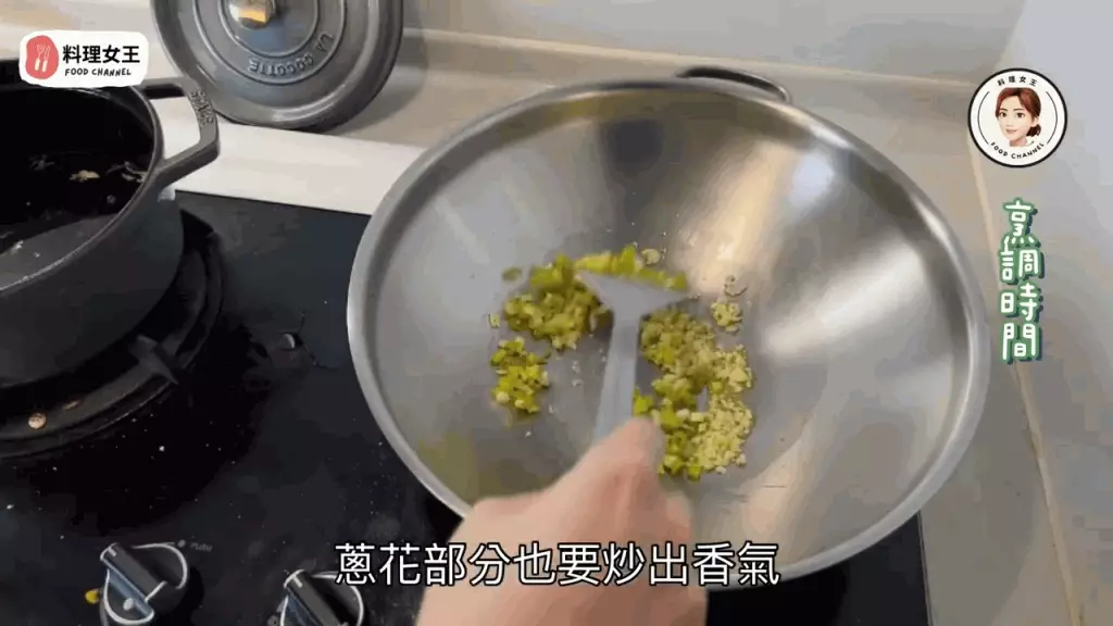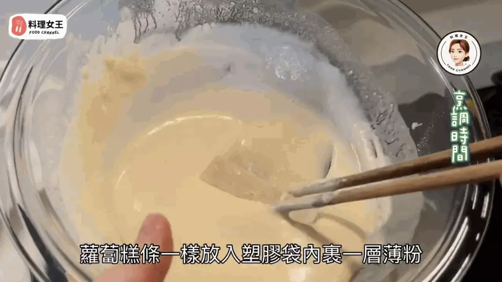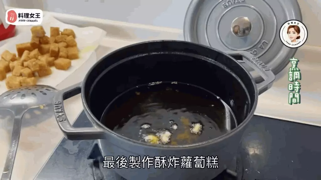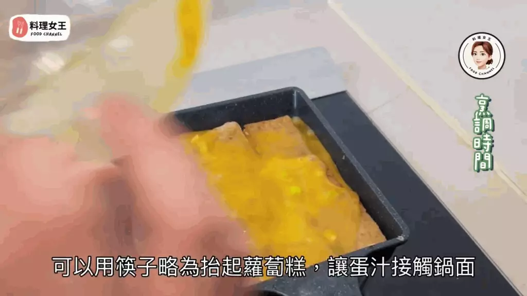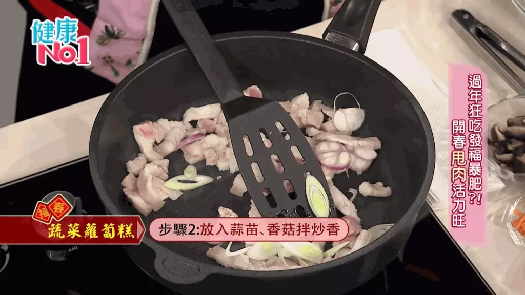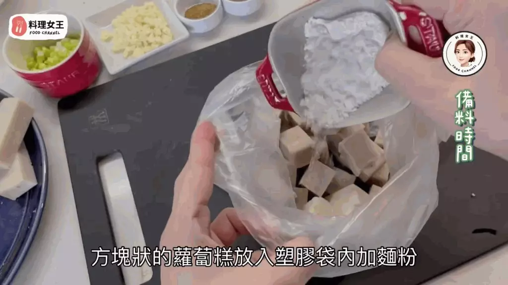 片段示範的是台式蘿蔔糕,但港式蘿蔔糕亦適合這種做法。加肉炒時,不用加油。