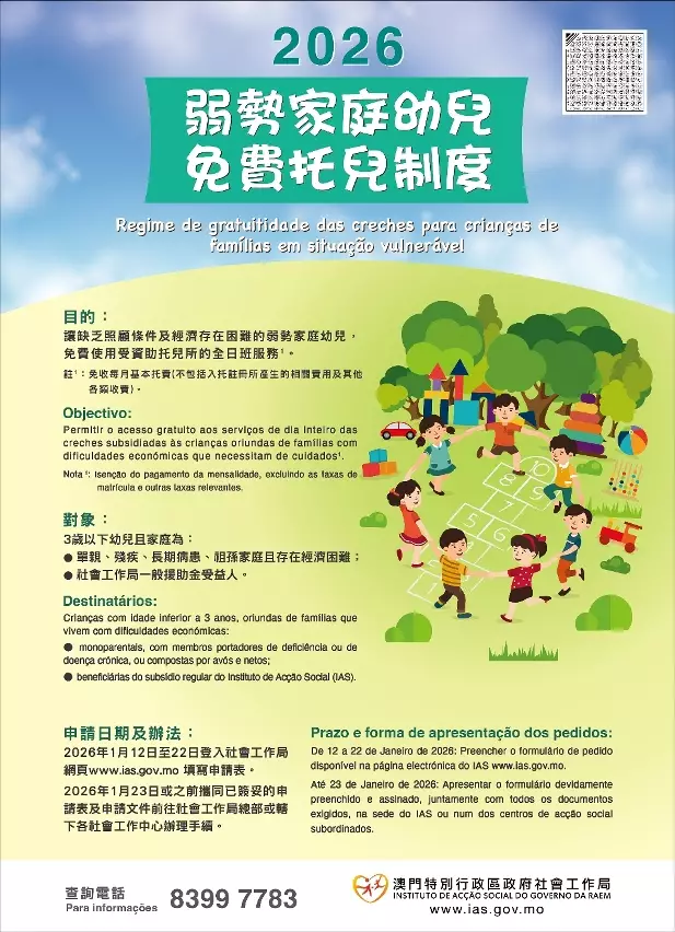 社會工作局協調30多間受資助托兒所推出「弱勢家庭幼兒免費托兒制度」,期望為缺乏照顧條件及經濟存在困難的弱勢家庭幼兒,提供申請免費使用受資助托兒所服務,於2026年1月12日起接受申請。