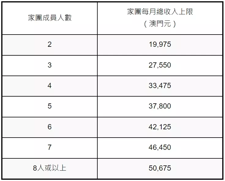 有關制度的申請幼兒須為3歲以下的澳門特區居民;家庭屬單親、殘疾、長期病患、祖孫家庭或一般援助金受益人的家庭;家庭每月總收入上限不超過以下所載的金額: