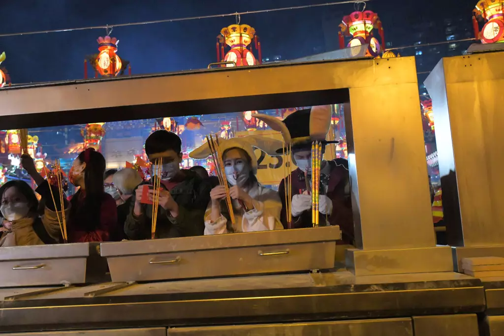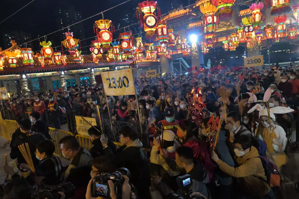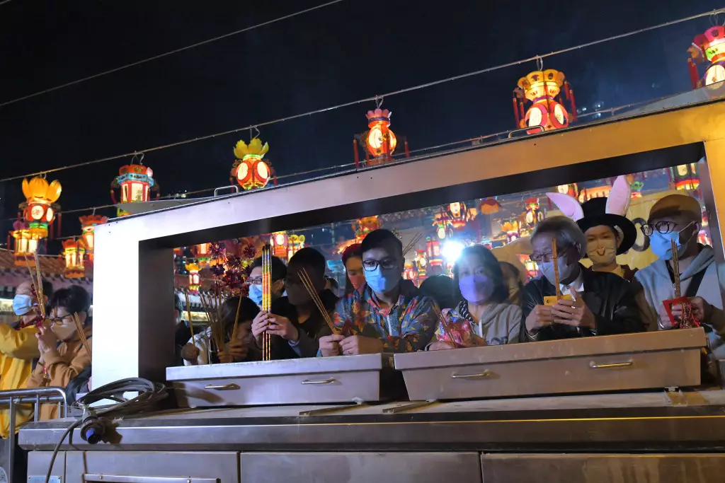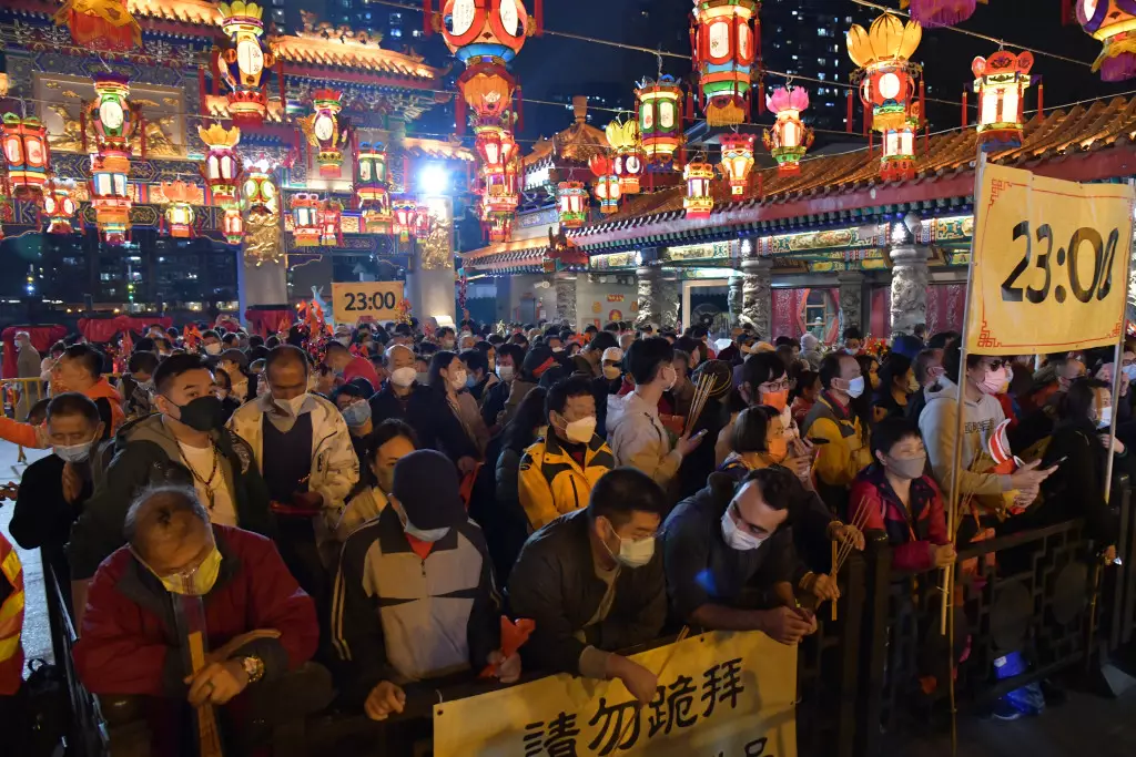 黃大仙祠因應疫情暫停兩年後,今年復辦頭炷香活動,晚上九時起開始分批開放善信入場,不少善信狂奔進入會場,希望搶得頭炷香的先機,至晚上11時前,大約有300名善信成功排在頭列上頭炷香的人龍中,現場懸掛「2300」的頭輪頭炷香時間,並有通告提示善信「請勿跪拜」「切勿擺放供品」等字眼,以免發生意外。
