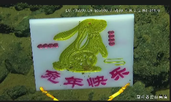 深淵科考隊員還在位於海溝的5810米深度,利用機械手布放「兔年快樂」的標誌物。