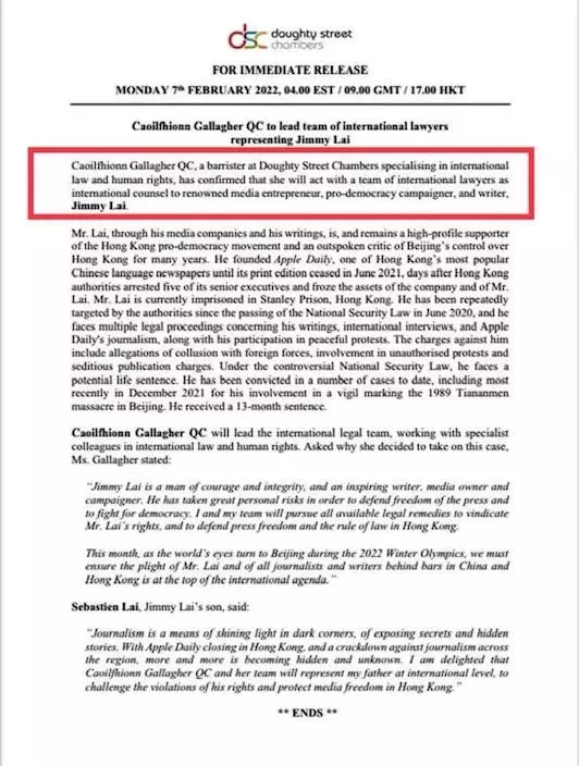 振英哥翻查資料,發現以英國御用大律師 Caoifhionn Gallagher為首的國際法律團隊,早於去年2月已公開聲稱,是正式代表黎智英,即是說,這個團隊在英國的所有舉動,事前必然得到黎的授意和授權。