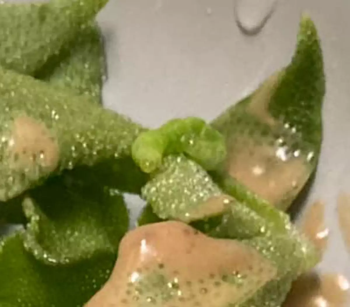 之後她將冰菜放上碟伴沙津醬食用,吃到一半才發現有異,事主表示自己驚見有條像菜莖一般肥粗的菜蟲附著在葉子上「看了一下冰花,嚇得尖叫馬上把它丟回盤中…有夠肥的啦!」驚嚇之餘也不忘拍照邀請眾網民一起找蟲!
