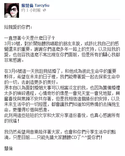 現年43歲的台灣資深玉女歌手蘇慧倫,今日透過經理公司發表結婚聲明,與相戀2年的44歲滑板代理商孫益民已於上周四公證結婚,自言百感交集,「心情一下天堂一下地獄」。
