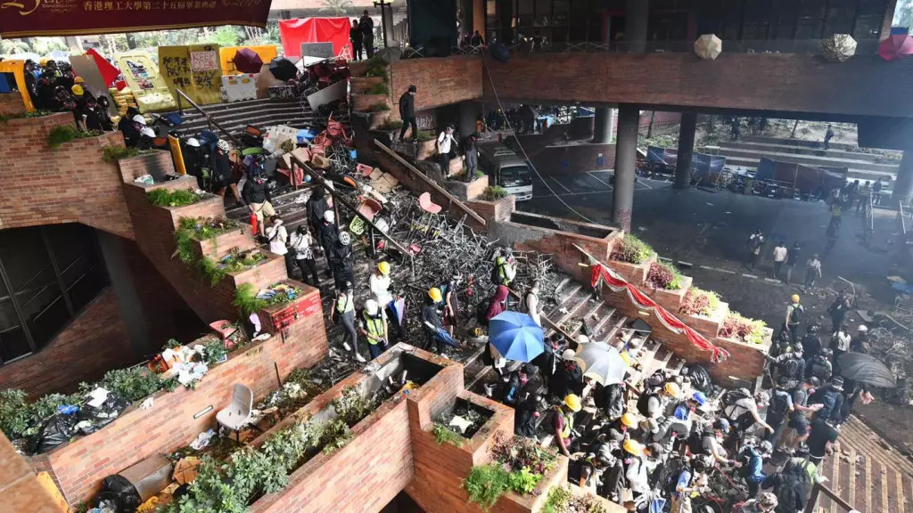 「理大圍城」期間,大批示威者聚集在理大擲物堵塞周邊道路、破壞校園設施: