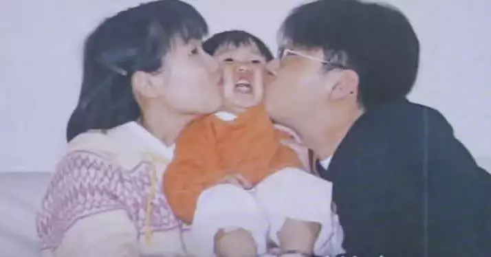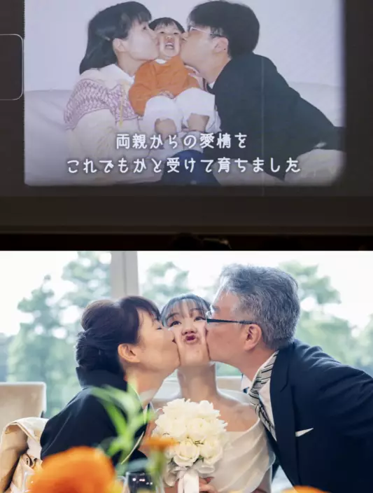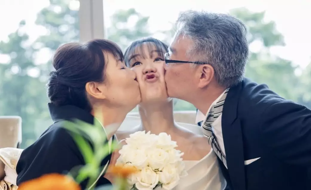 日本一名新娘獲攝影師建議,在婚禮上與父母拍另類全家福,重現年幼時獲雙親同時親吻的畫面,幽默又溫馨。