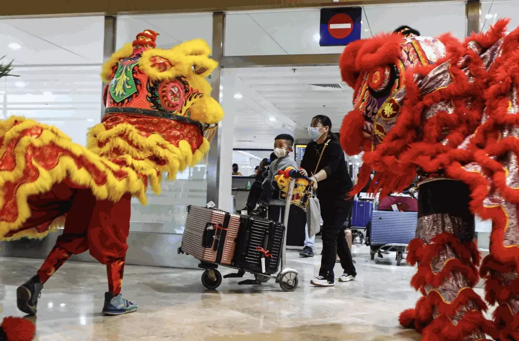 馬尼拉國際機場上周舞龍舞獅歡迎中國遊客入境。 美聯社