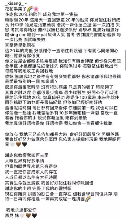 AK又感恩花花20年來沒有特別病痛,只是真的老了:「差唔多100歲啦,本來仲諗住同你挑戰長壽貓紀錄,但依(𠵱)家已經好叻好叻,最後呢段時間,每日都有來看你,你離開前一晚,我也可以在你旁邊一起睡,我地(哋)差唔多有10多年無咁樣一齊瞓,當晚一直看著拖着你的手,感受你嘅溫度,陪你到最後,我地真係好唔捨得你」。最後AK感謝花花教懂他如何去愛,並表示會努力做好承諾為花花做的事,網民及「生粉」(Fans)紛紛留言叫AK保重,並表示:「花花活到20歲已經好叻」。