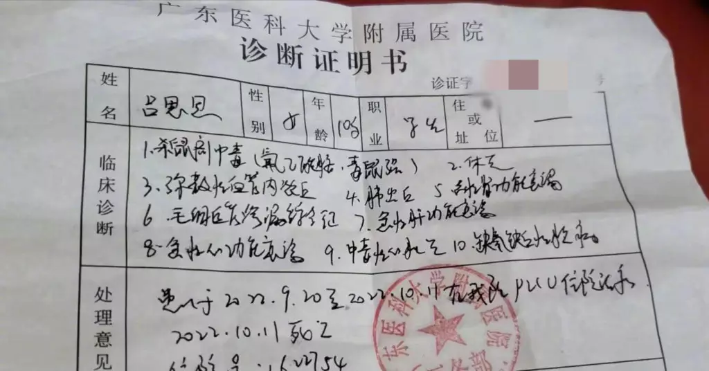 據湛藍視頻報道,事發在去年9月20日,廣東湛江10歲的小學生呂思思,去年9月食用校外面包店的麵包中毒,住院20多日後經搶救無效身亡。女童去世後,當地公安查明死因是氟乙酰胺類殺鼠藥中毒死亡。