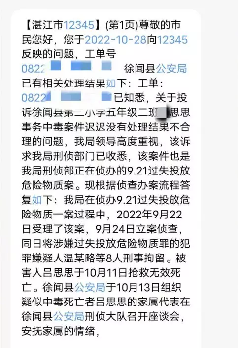 呂思思父親向傳媒表示,警方日前已發出死因鑑定意見通知書,顯示呂女的死亡是由氟乙酰胺類殺鼠藥造成。而辦案民警曾向他解釋,經過初步調查,徐聞縣第一鮮麵包房的食品加工人員,因發現店內有鼠患,購買了殺鼠藥放置在店內以毒殺出沒店內的老鼠。而老鼠將老鼠藥帶入了麵粉中,麵包制作人員在不知情的情況下用麵粉制作麵包,成品麵包部分在店內售賣,部分批發到思思學校附近的小賣部。購買這一批次麵包的部分人員出現了肚瀉的情況,公安以「過失投放危險物質」為案由立案,目前案件仍在進一步調查之中,據悉,已有8名涉案人員被刑事拘留。