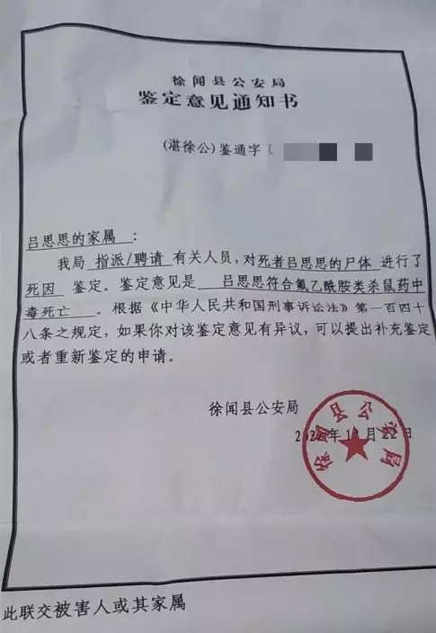 女童父親稱,警方日前已發出死因鑑定意見通知書,顯示呂女的死亡是由氟乙酰胺類殺鼠藥造成。微博圖