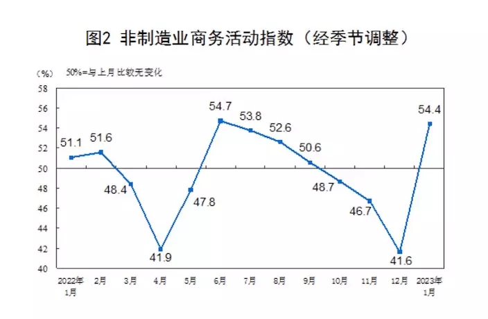 1月31日,國家統計局公佈2023年1月中國採購經理指數(PMI)運行情況。製造業採購經理指數、非製造業商務活動指數和綜合PMI產出指數分別為50.1%、54.4%和52.9%,高於上月3.1、12.8和10.3個百分點,三大指數均升至擴張區間,顯示中國經濟景氣水平明顯回升。