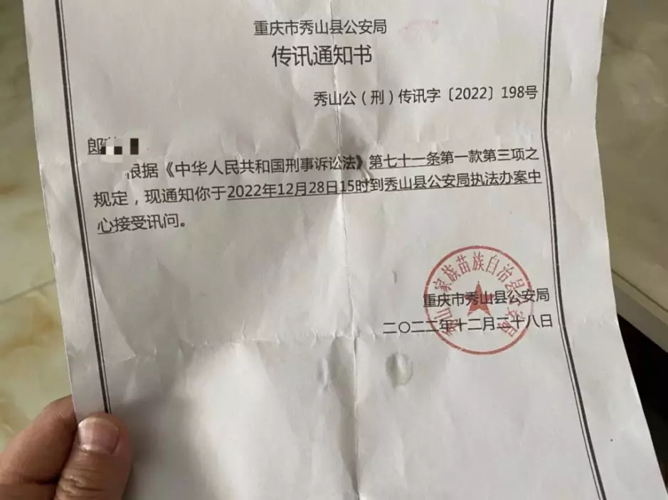 在被秀山警方以涉嫌妨害傳染病防治罪立案偵查後,郎隘渝被警方三次傳訊,這是最後一次傳訊通知書。