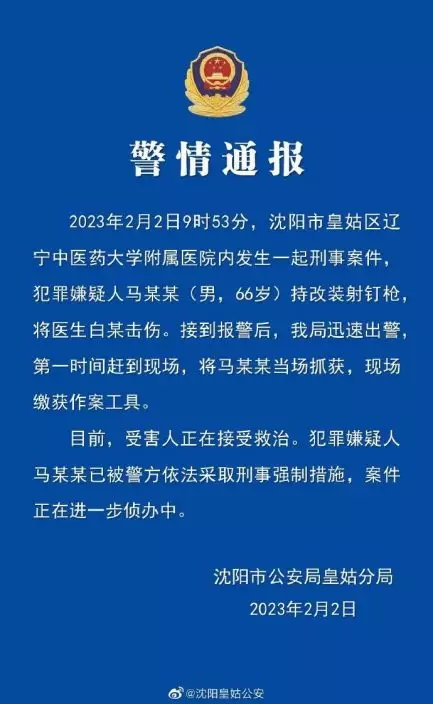 2月2日晚,遼寧省瀋陽市公安局皇姑分局發布警情通報:2023年2月2日9時53分,遼寧中醫藥大學附屬醫院內發生一宗刑事案件,疑犯馬某某(男,66歲)持改裝射釘槍,將醫生白某擊傷。接到報警後,警方到場將馬某某抓獲,現場繳獲作案工具。