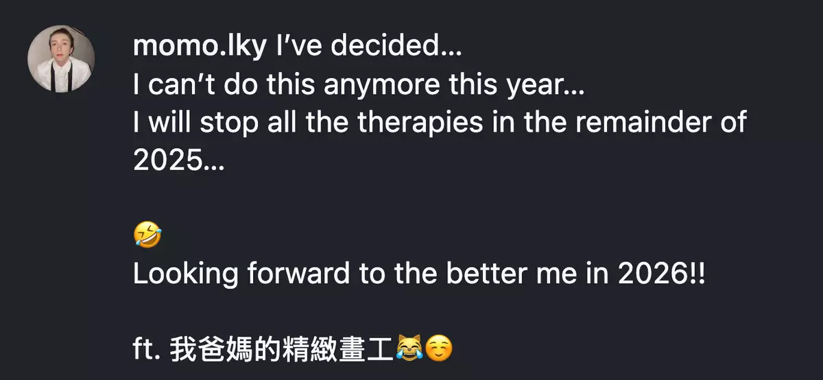在踏入2026年前數小時,阿Mo在IG晒出自己的最新近照,以及父母的精緻畫工,並笑言決定在2025年餘下的時間「停止所有治療」,同時期待2026年的他會變得更好!見到阿Mo心情雀躍,對來年充滿希望,不少網民都紛紛留言為他加油打氣!
