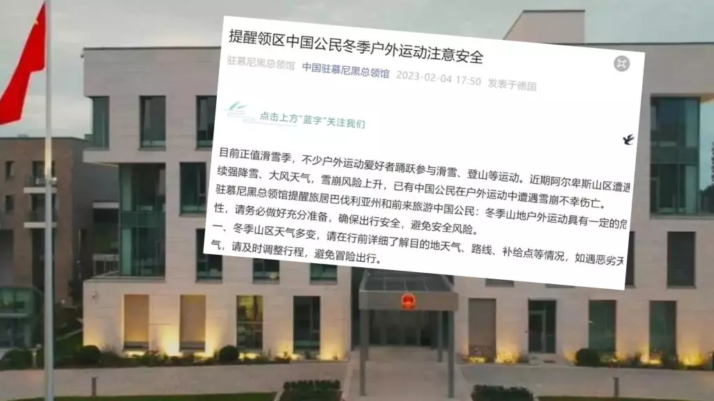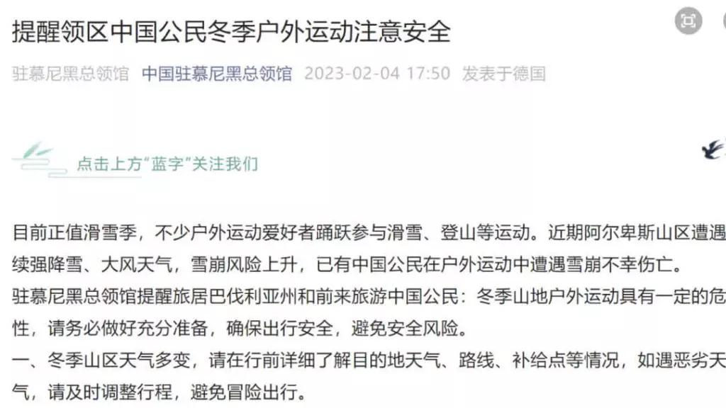 中國駐慕尼黑總領事館提醒中國公民注意冬季運動安全。網圖