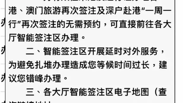 報道又引述深圳市當局表示,智能簽注區開展延時對外服務,為避免擠擁在同一時間辦理或等候時間過長,建議市民錯鋒辦理。