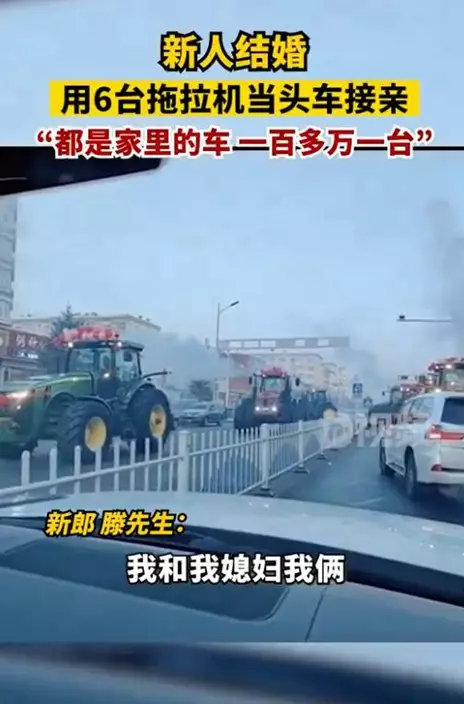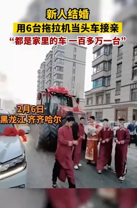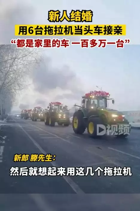最近,在黑龍江省齊齊哈爾市,新郎滕先生在結婚當天,出動6部價值百萬的拖拉機當頭車接親。滕先生表示,和妻子認識6年了,想有一個不一樣的婚禮,就用了家裡的拖拉機,接親途中引來好奇的民眾駐足圍觀拍照,感覺很有氣氛。